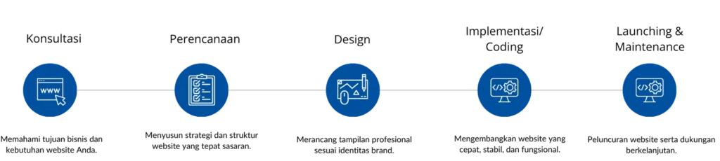 Untuk memastikan website yang dibuat sesuai dengan kebutuhan bisnis, proses pengerjaan dilakukan melalui beberapa tahapan yang terstruktur dan transparan.